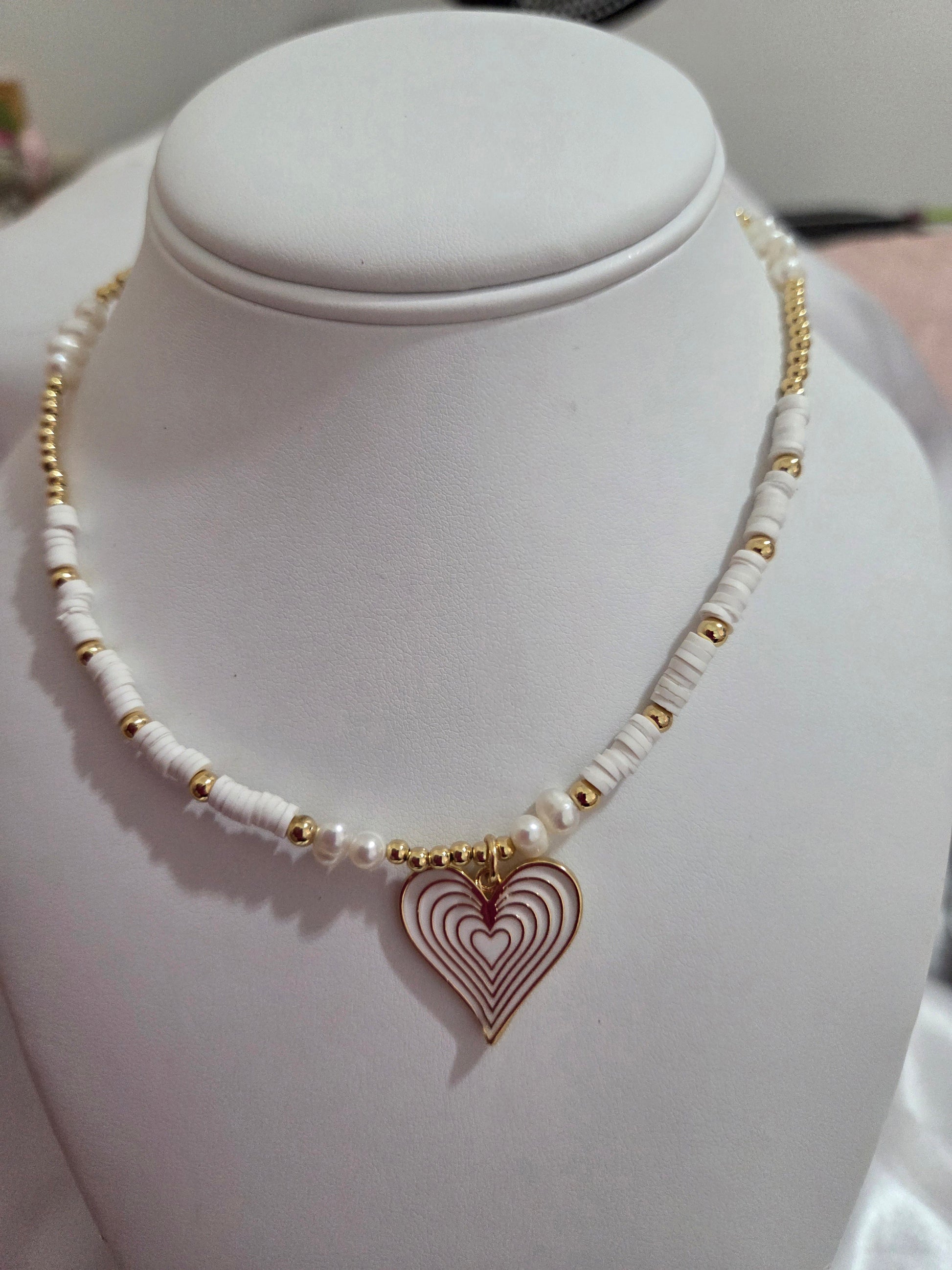 Heart Pendant Necklace Choker – Natural Pearl & Polymer Clay Heishi Beads Jewelry